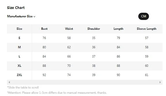 Please allow 1-3cm differs due to manual measurement, thanks.