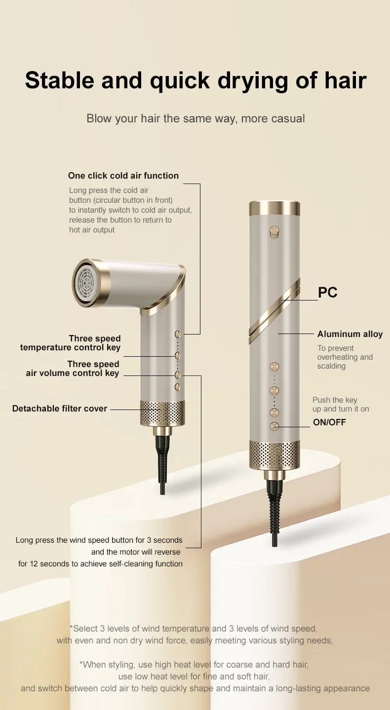Innovative rotating design,two modes of blowing andshaping, one second switching.brand new damping.no need for buttons
