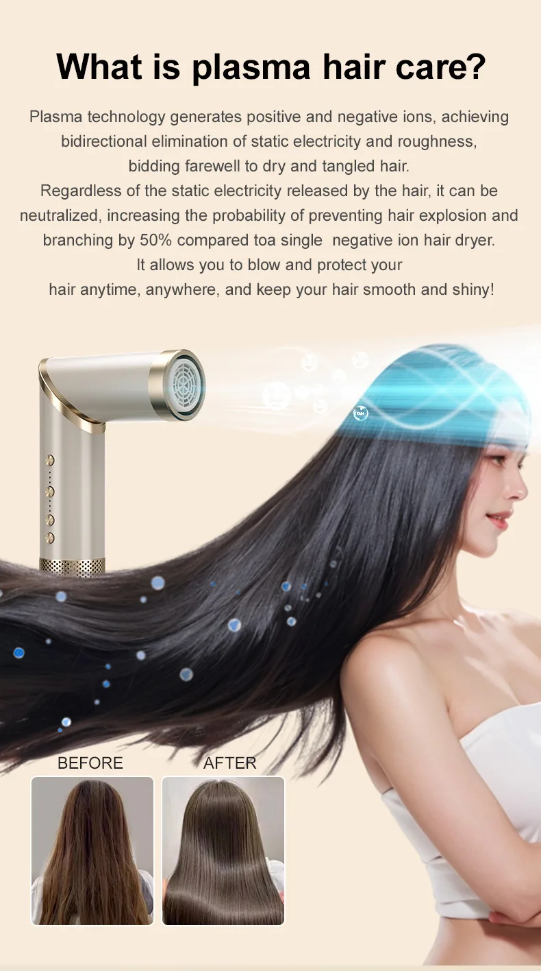 Plasma technology generates positive and negative ions, achieving bidirectional elimination of static electricity and roughness,bidding farewell to dry and tangled hair.Regardless of the static electricity released by the hair, it can beneutralized, increasing the probability of preventing hair explosion and branching by 50% compared toa single negative ion hair dryer.It allows you to blow and protect your hair anytime, anywhere, and keep your hair smooth and shiny!