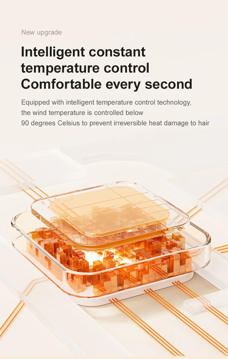 Equipped with intelligent temperature control technology,the wind temperature is controlled below 90 degrees Celsius to prevent irreversible heat damage to hair