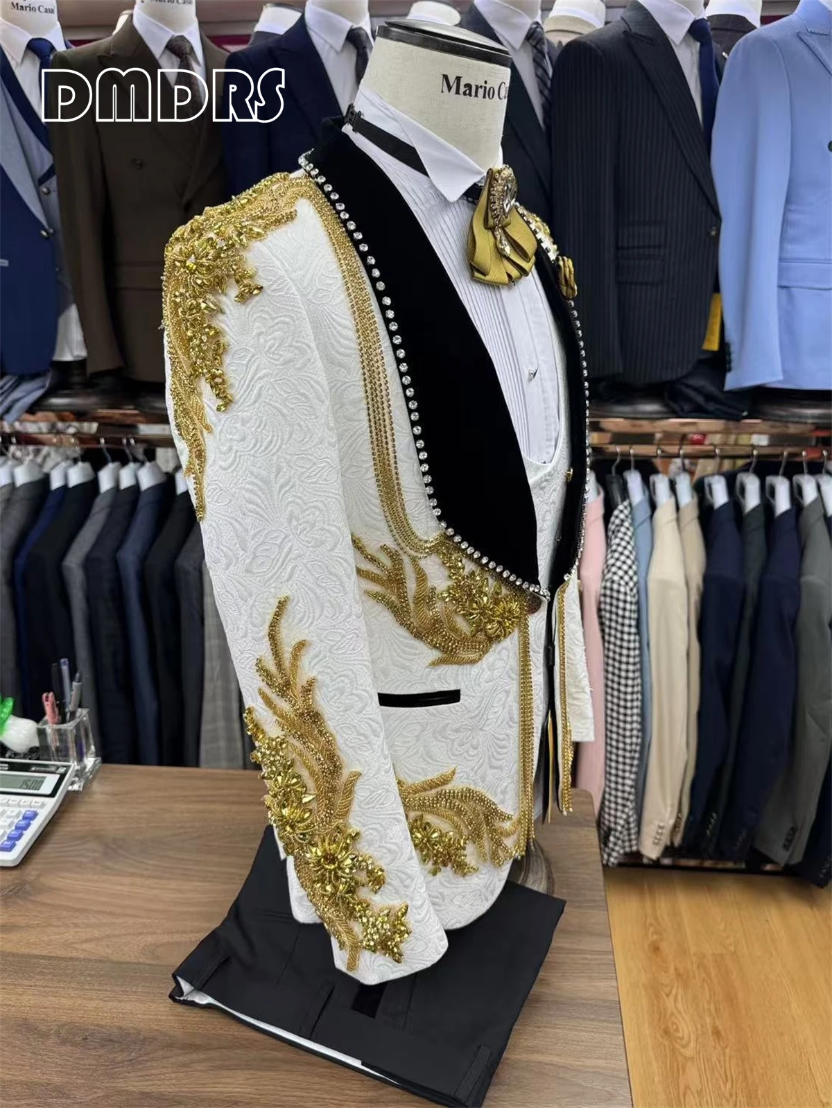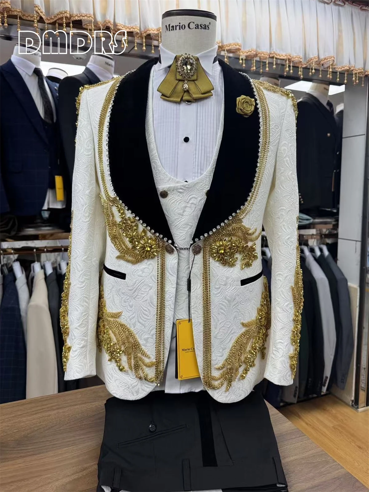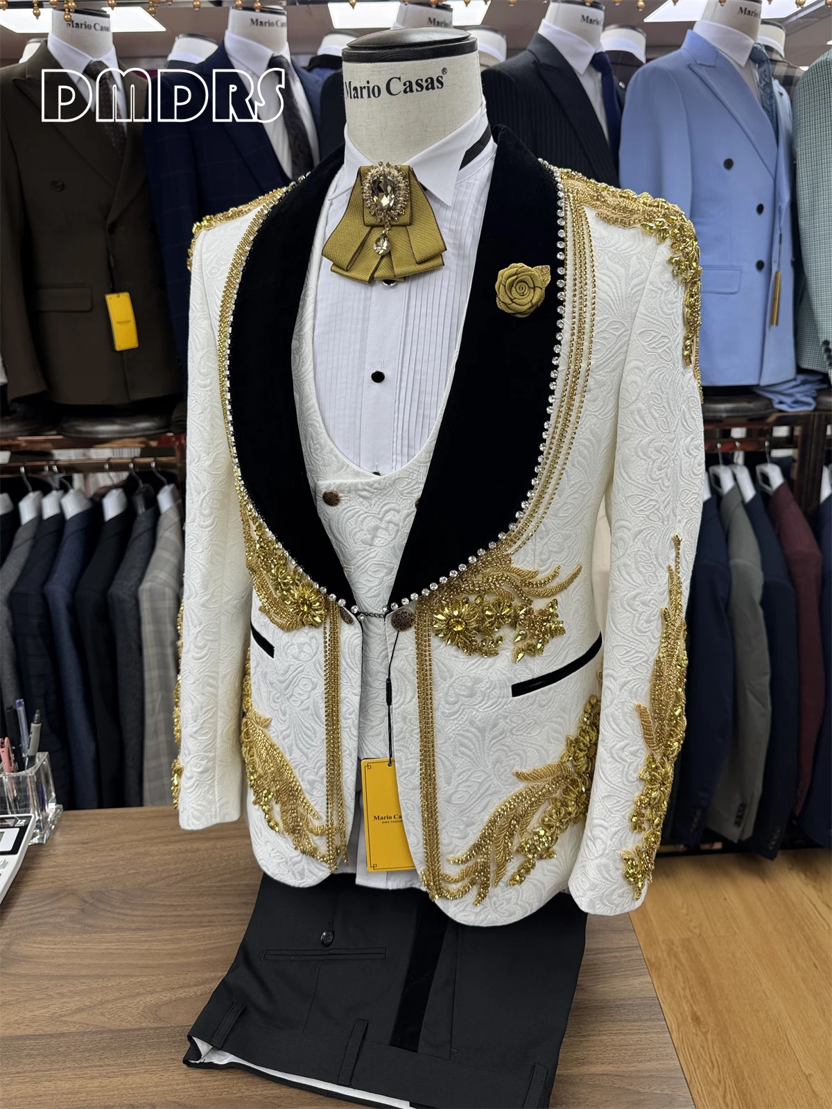 DTLumika Gold Beads Appliques Suit Set for Men, Luxury Three Pieces Men’s Jacquard Suit Set, Blazer Jacket Vest Pants Costume