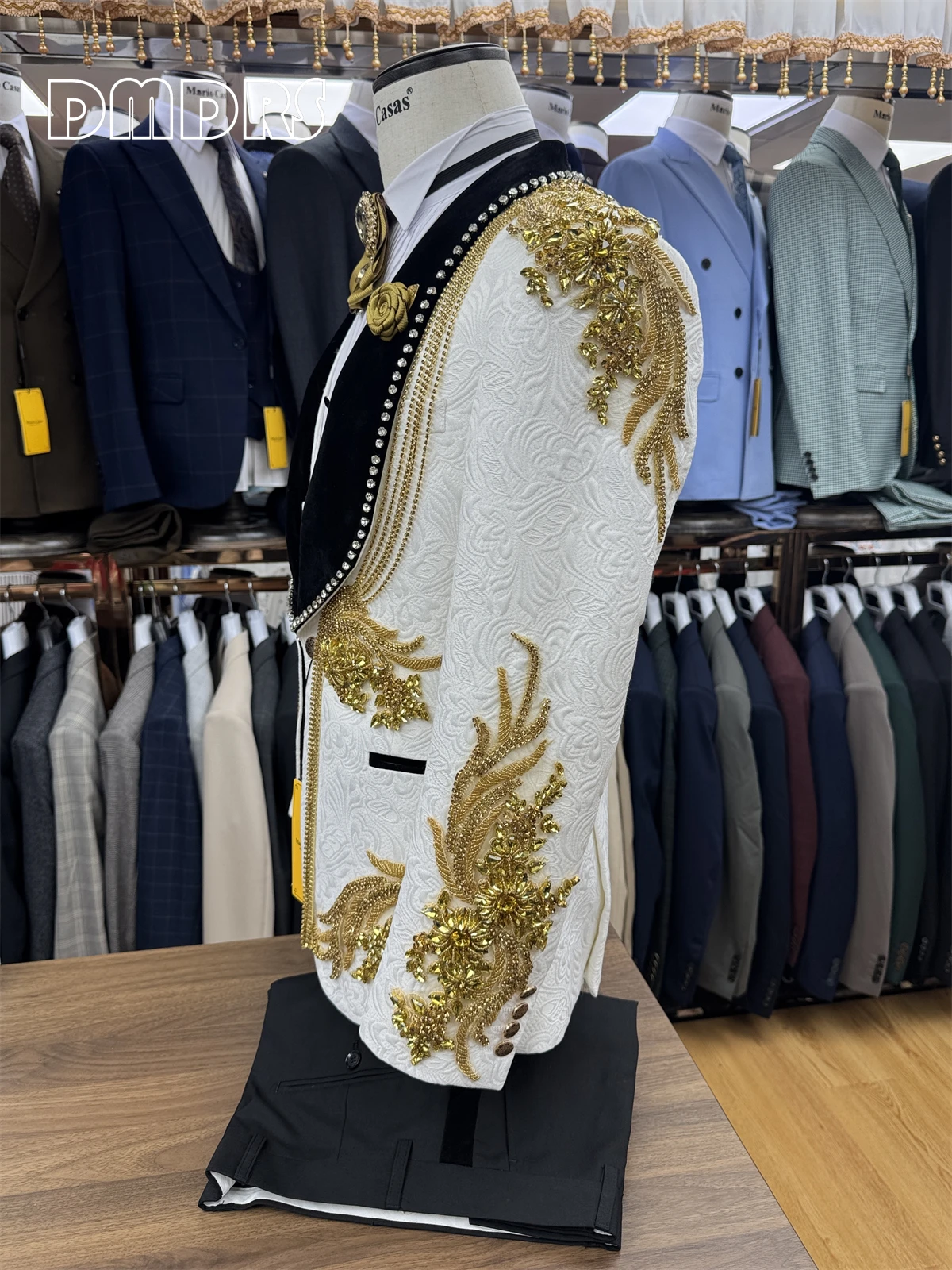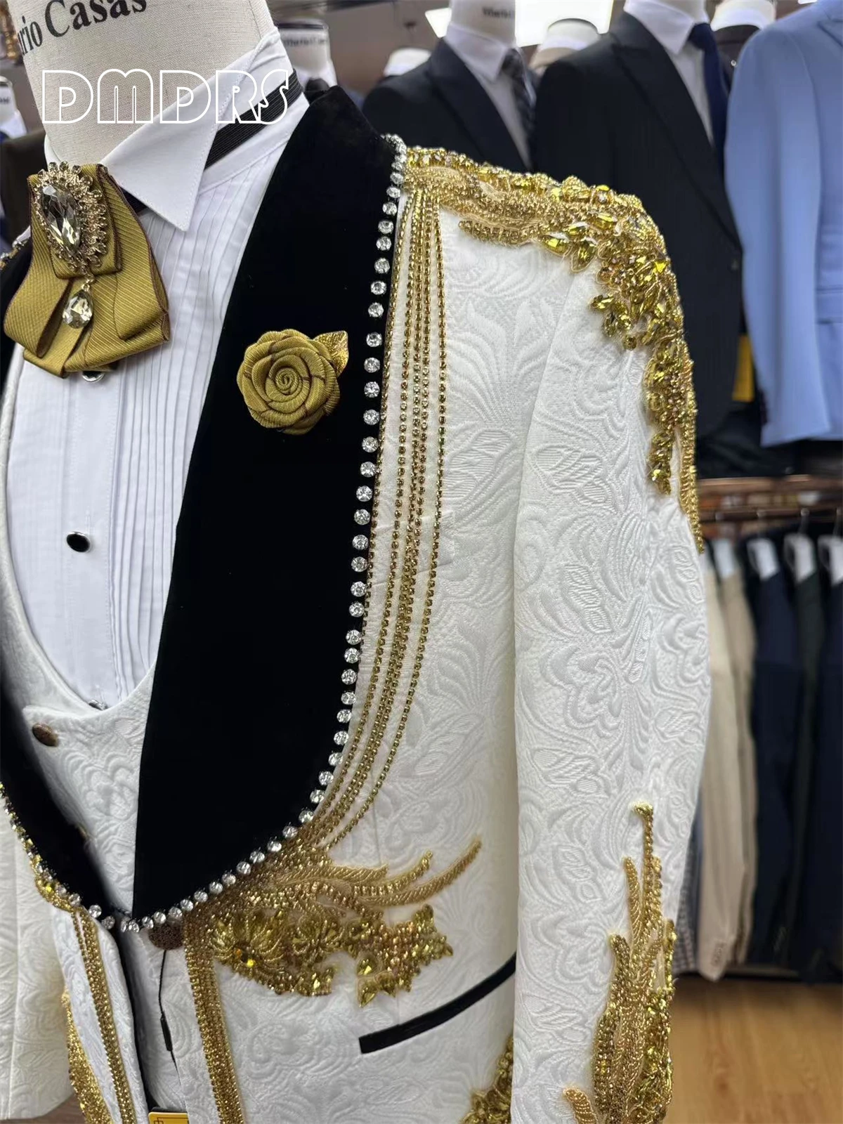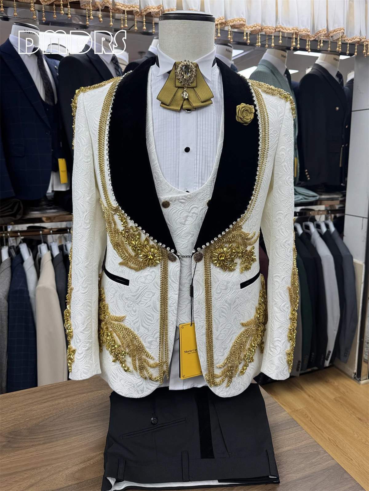 DTLumika Gold Beads Appliques Suit Set for Men, Luxury Three Pieces Men’s Jacquard Suit Set, Blazer Jacket Vest Pants Costume