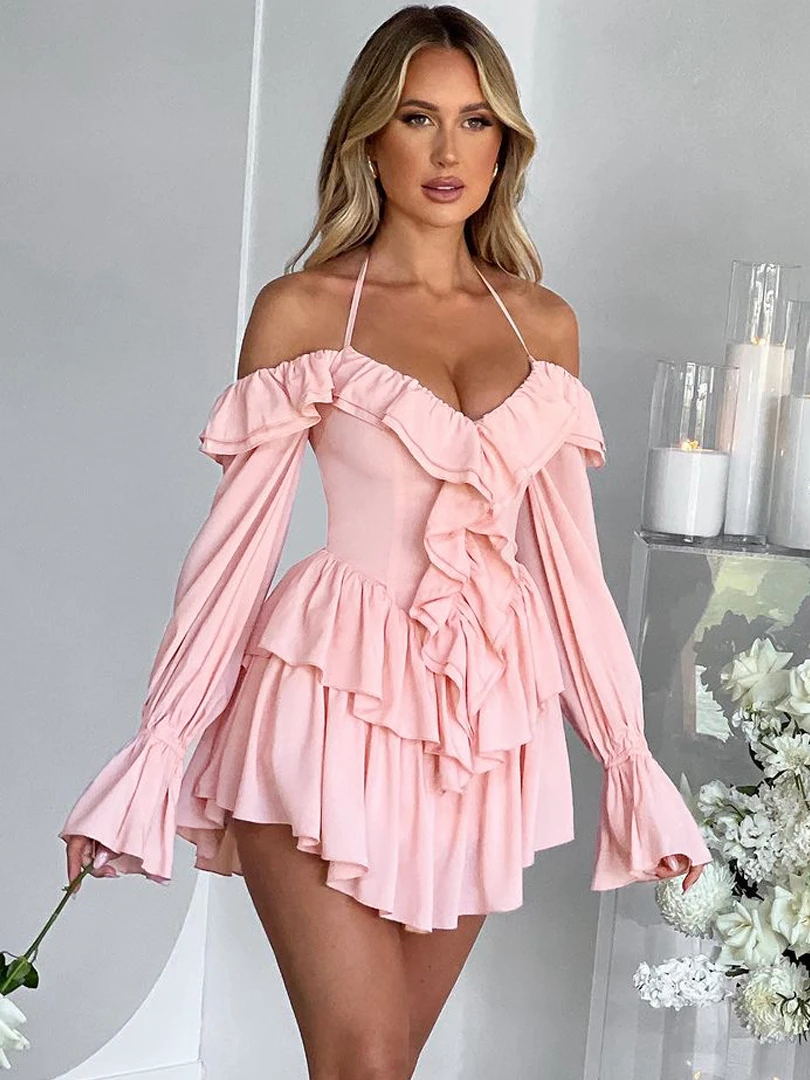 Dulzura Solid Pure Color Halter Ruffle Flare Sleeves Mini Dress 2024 Summer For Women Sexy Elegant Birthday Party Clubwear