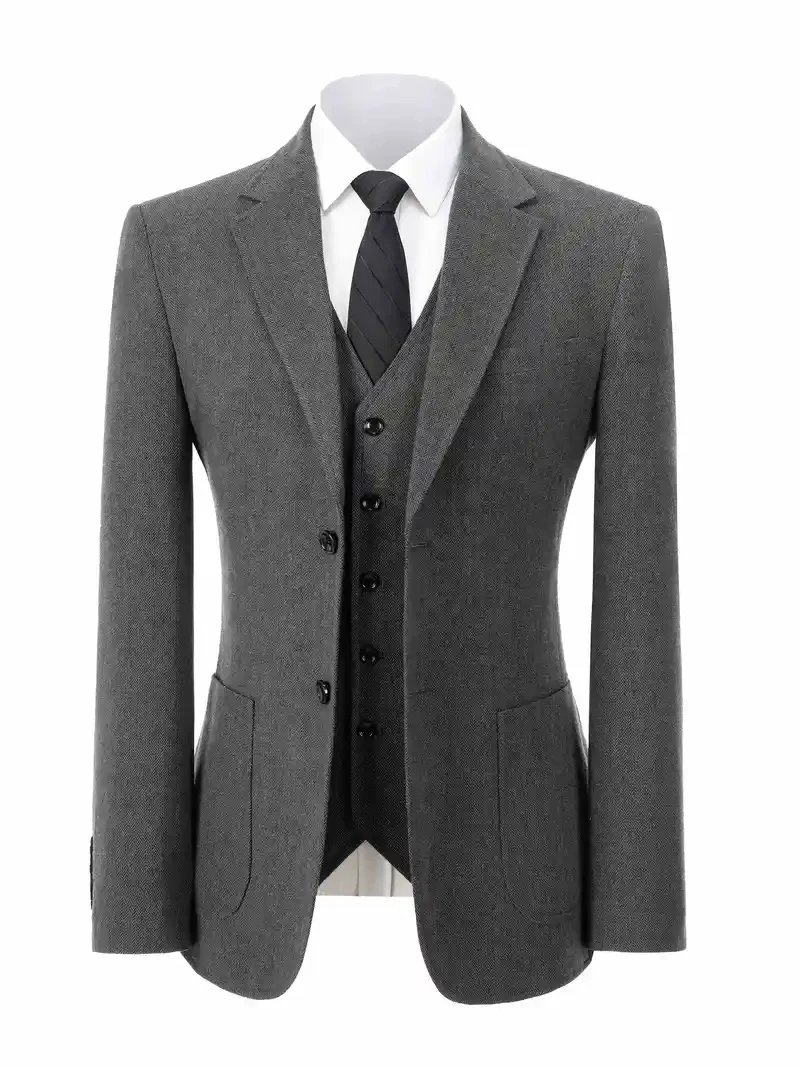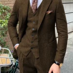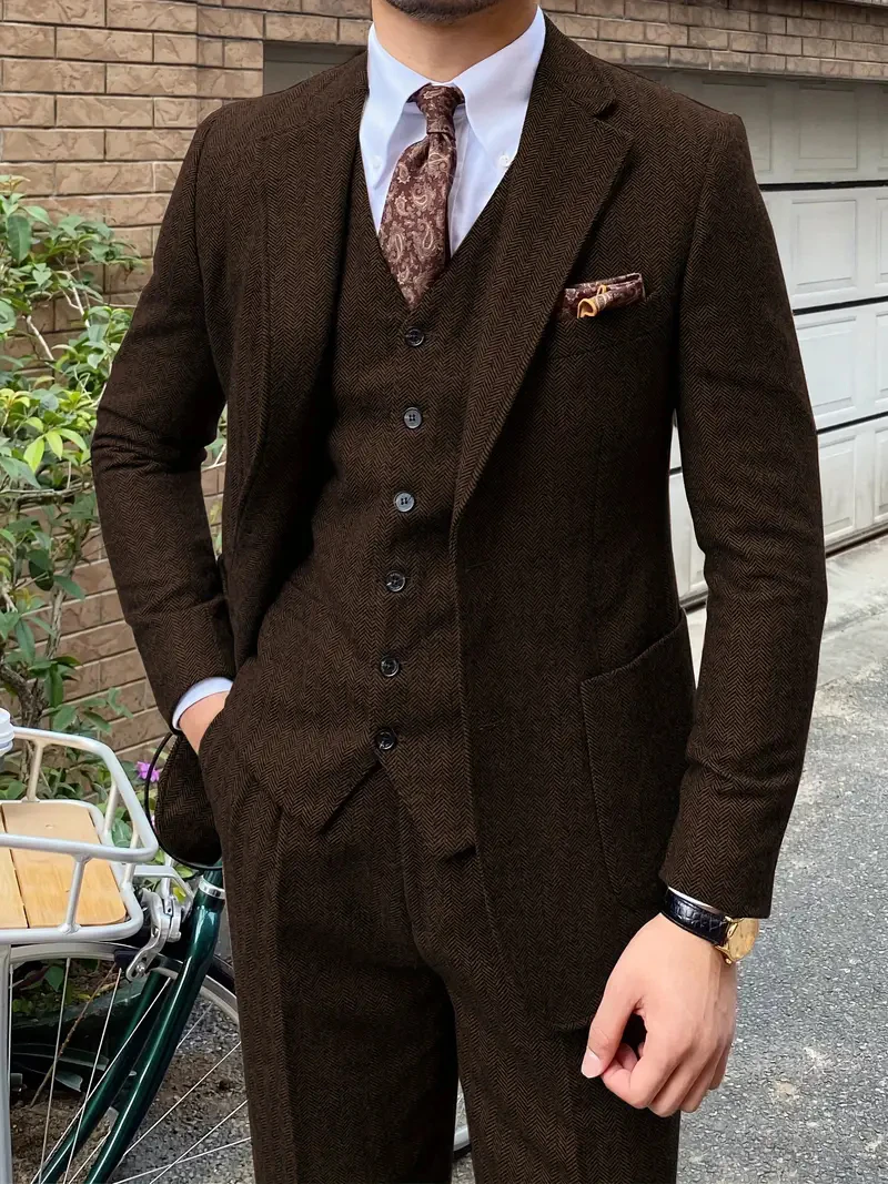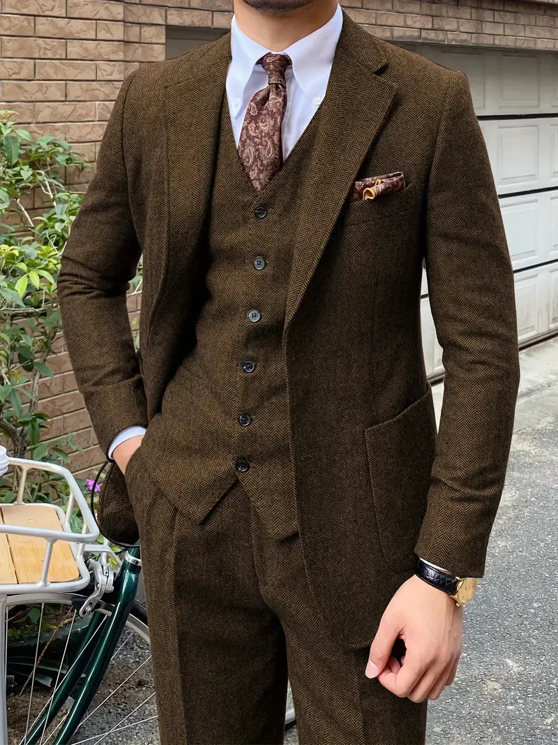 Elegant 3pcs Men’s Tweed Suits Wool Blend Herringbone Western Vintage Wedding Formal Events (Jacket+Vest+Pants)