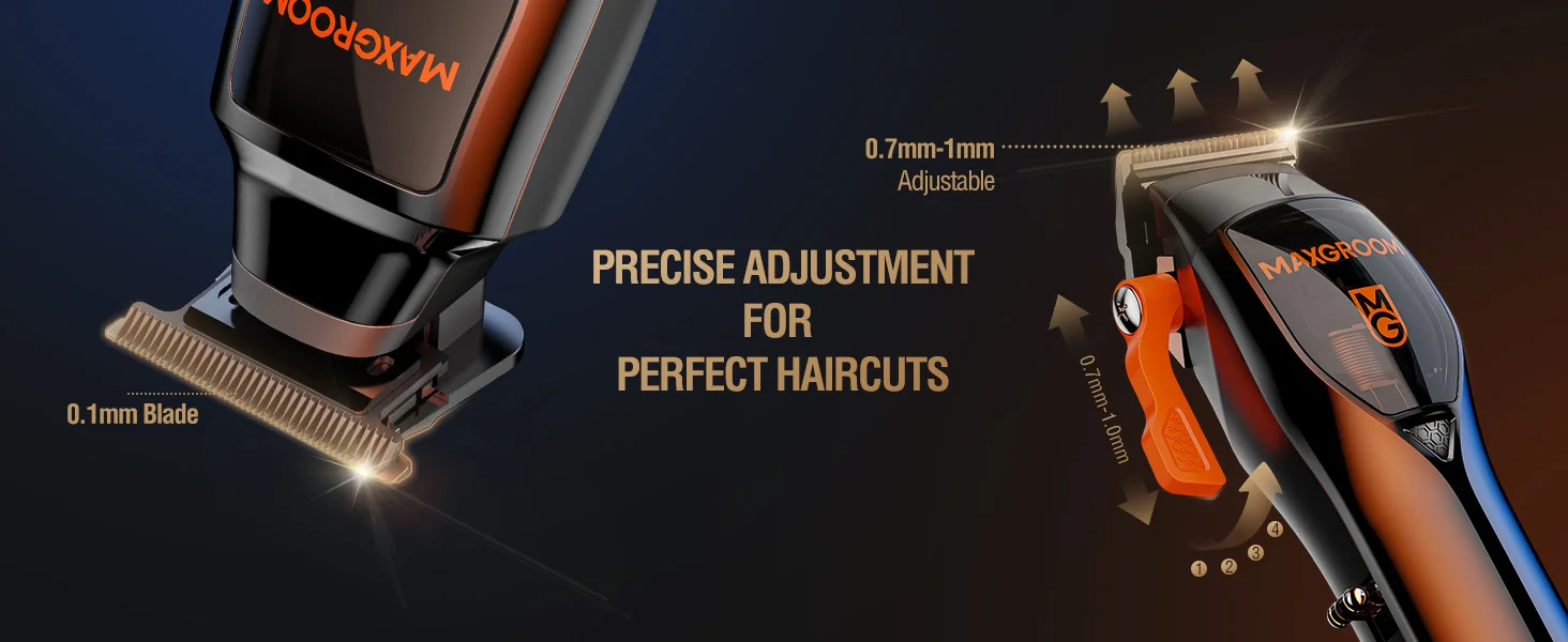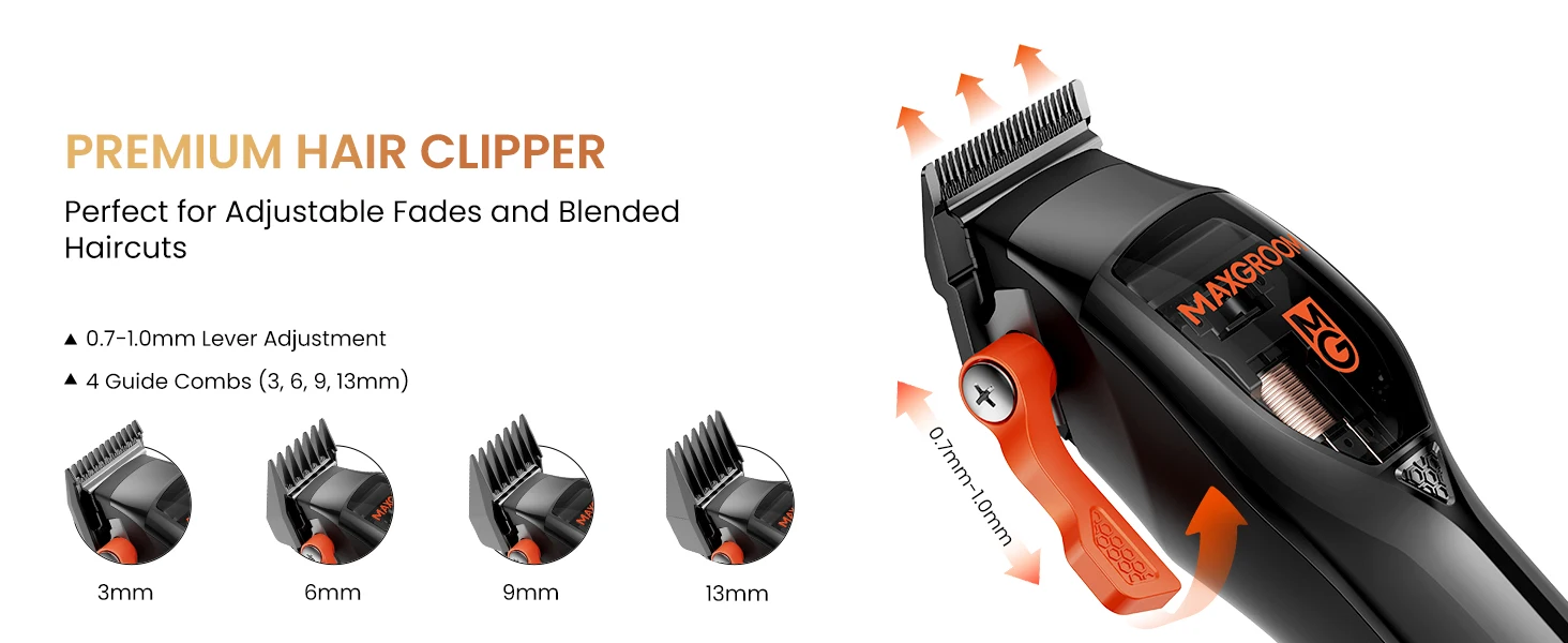 The knife head is equipped with a four-level fine-tuning adjustment handle ranging from 0.7 to 1.0MM, creating a gradient layering effect. It comes with a four-level original limit comb, allowing for personalized styling. Ergonomic, with honeycomb anti-slip on the back, it increases the heat dissipation area.