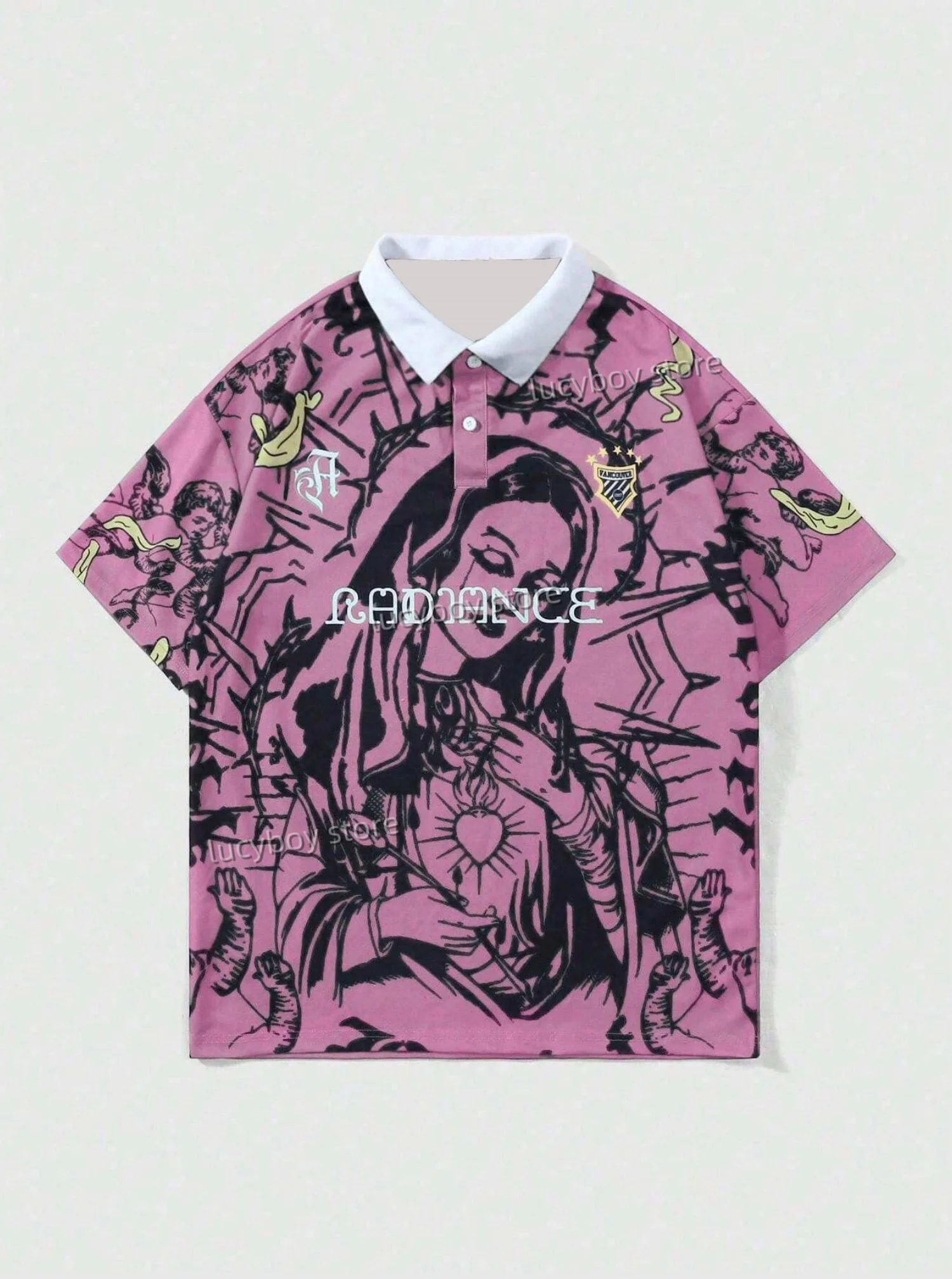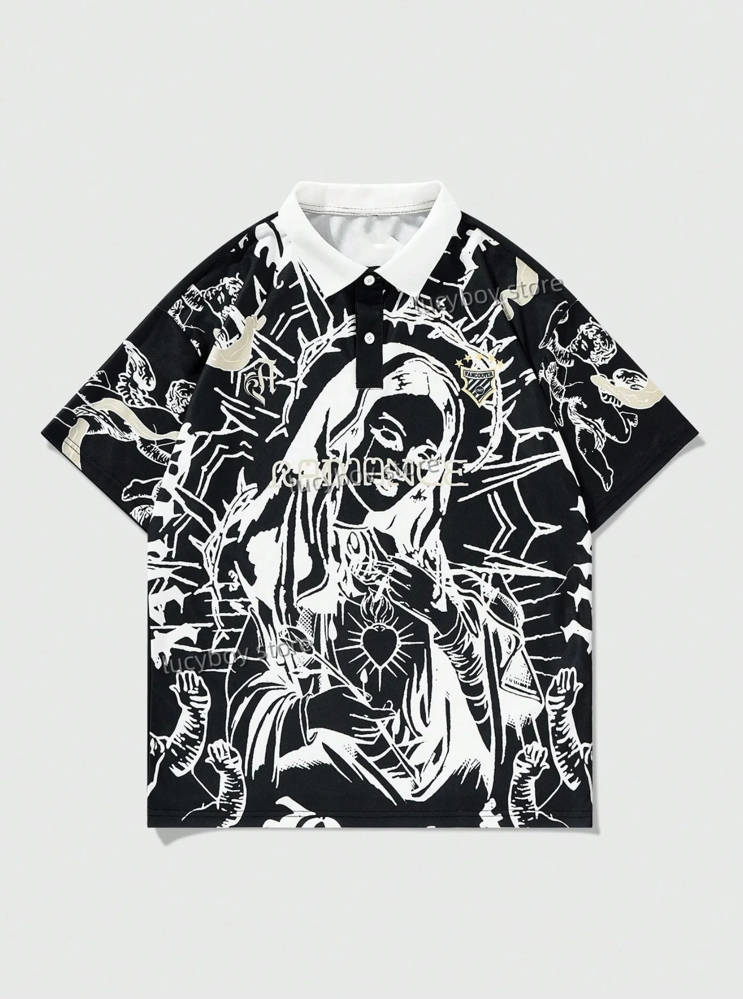 New IN Men’s Summer Short Sleevedpolo Shirt Virgin Mary Printed Striped Polo Shirt Men Busibness Casual Top Men Clothing