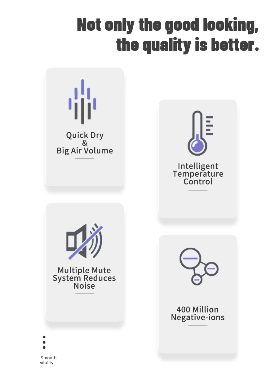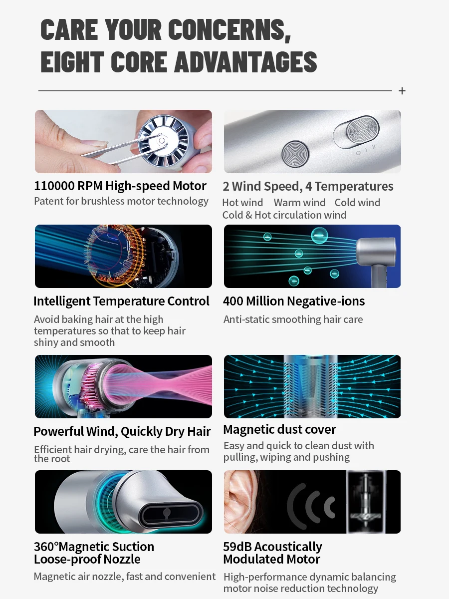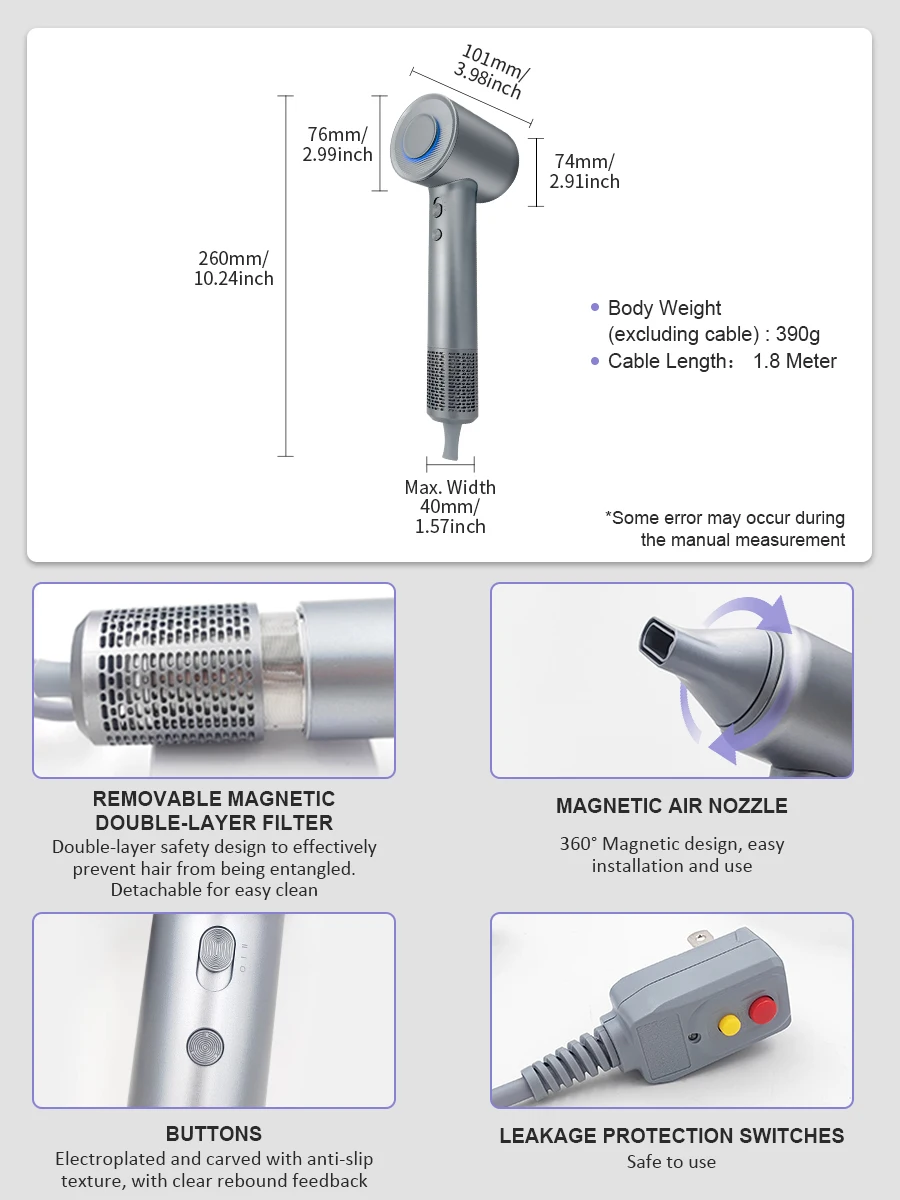 – Lightning-fast Dryer: Max.wind speed of 48m/s, instantly removes moisture from the hair, 5 times and 80% more efficiently than others