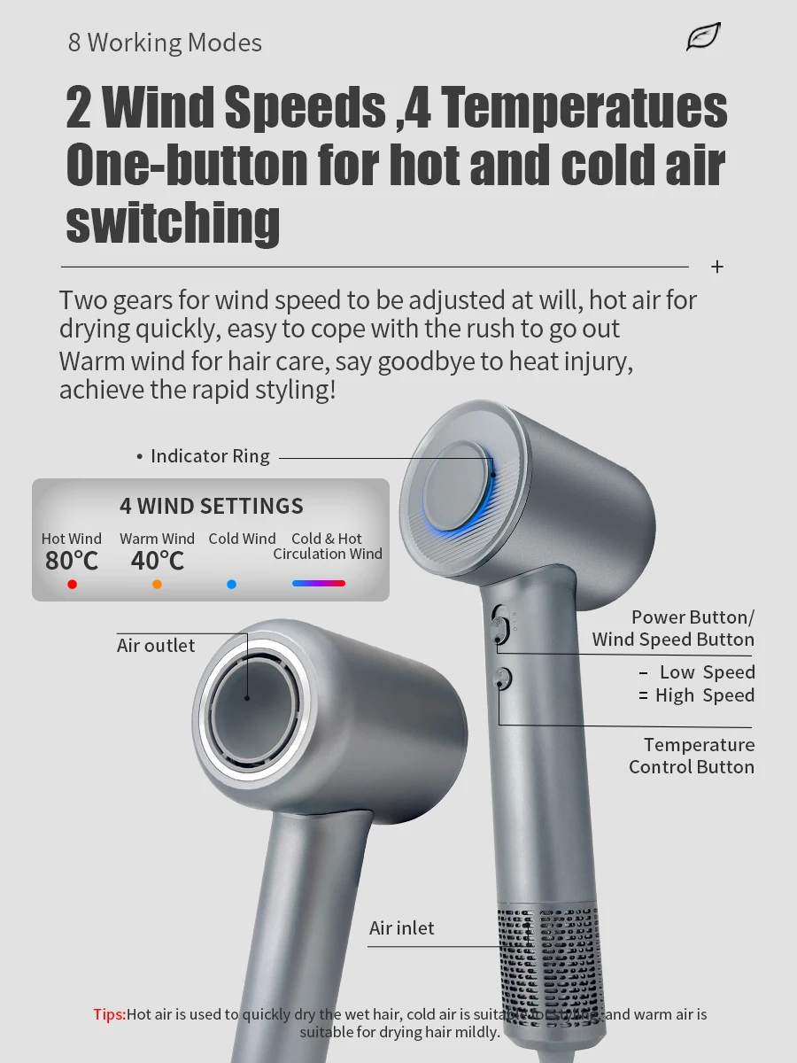 – 2 Wind Speeds & 4 Temperature: More accurate setting for different hair situation, suitable for the whole family