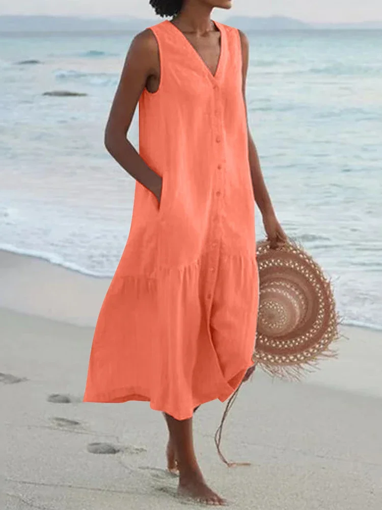 Summer Loose Casual Patchwork Cotton Linen Pocktes Dress V Neck Beach Style Dress Sleeveless Vintage Club Midi Solid Women Dress
