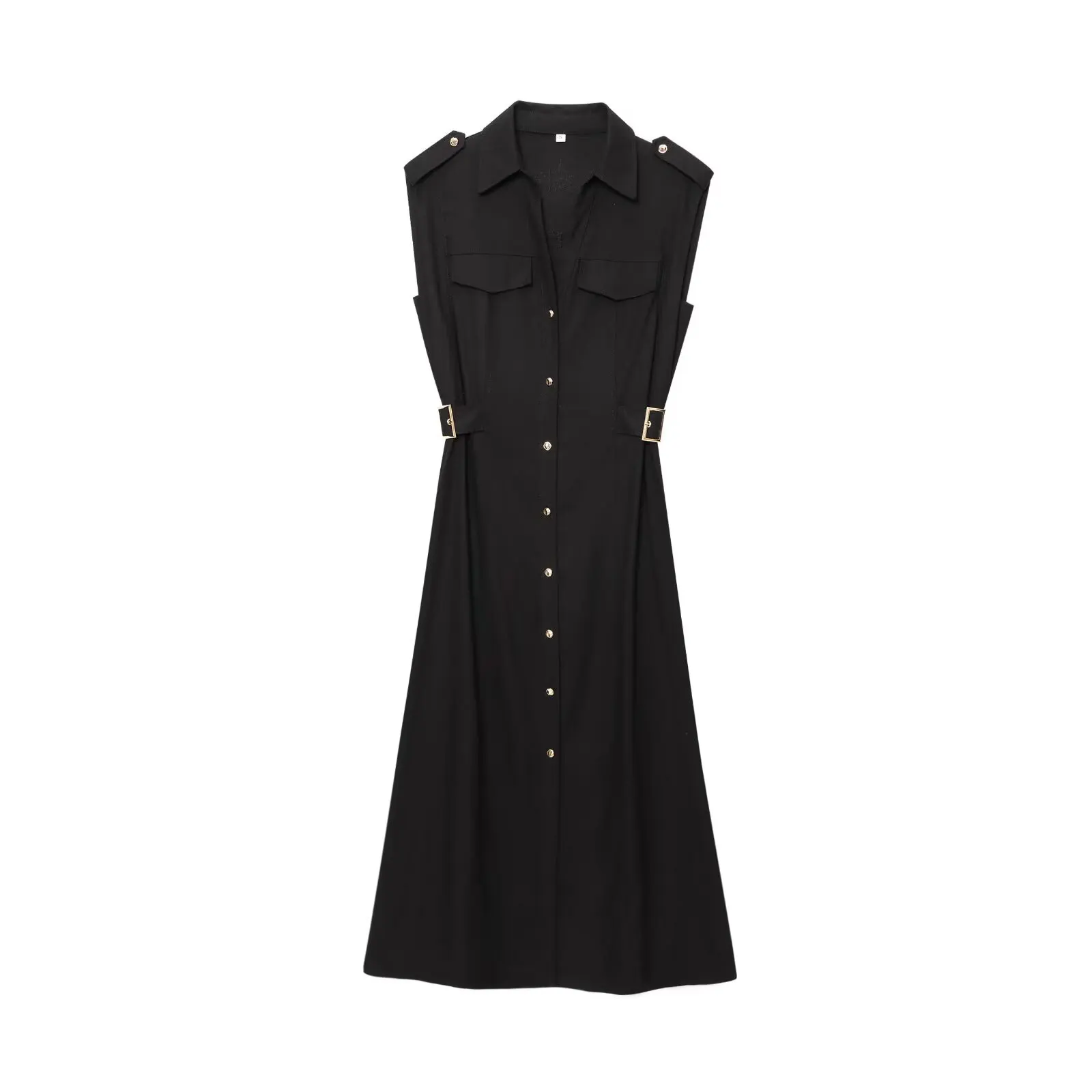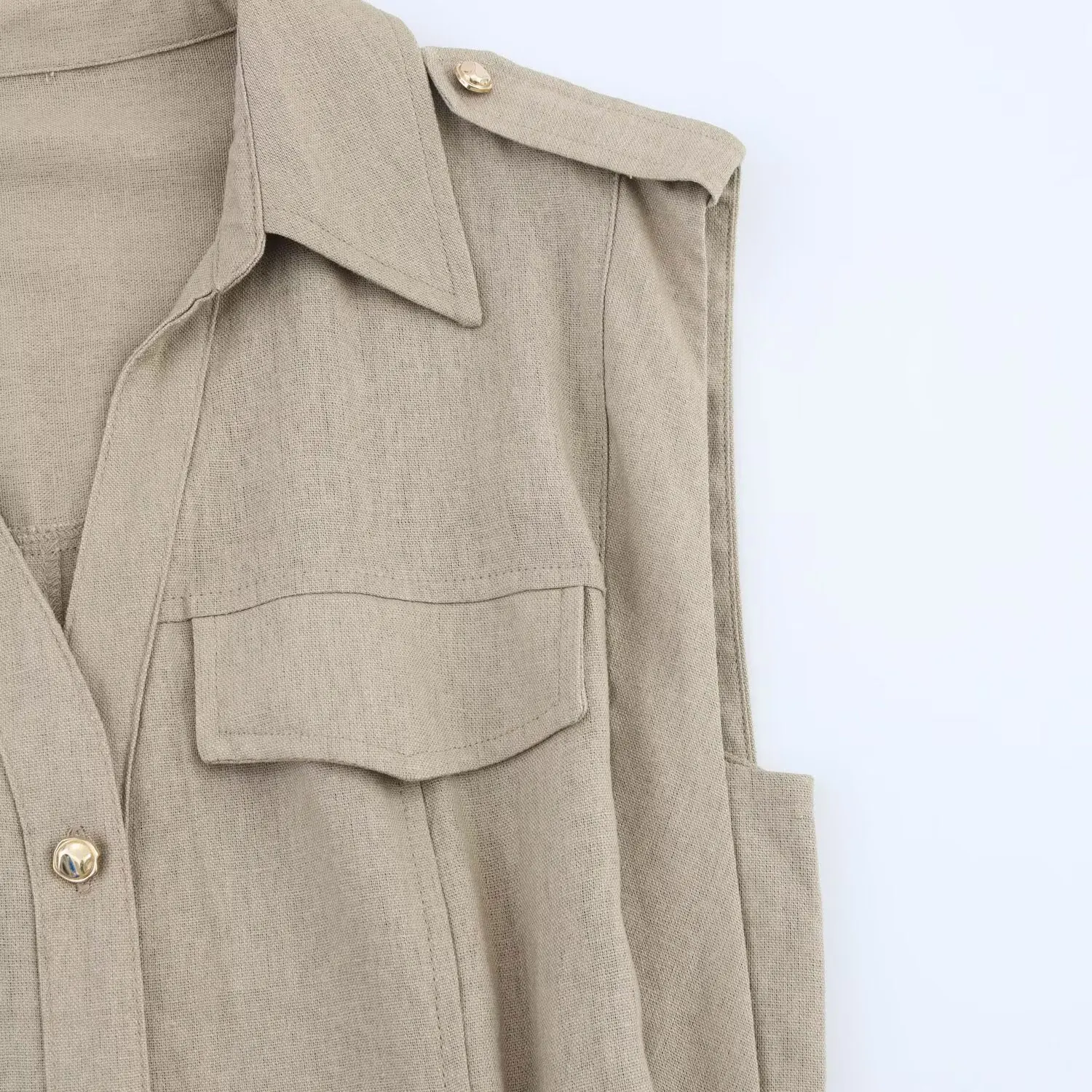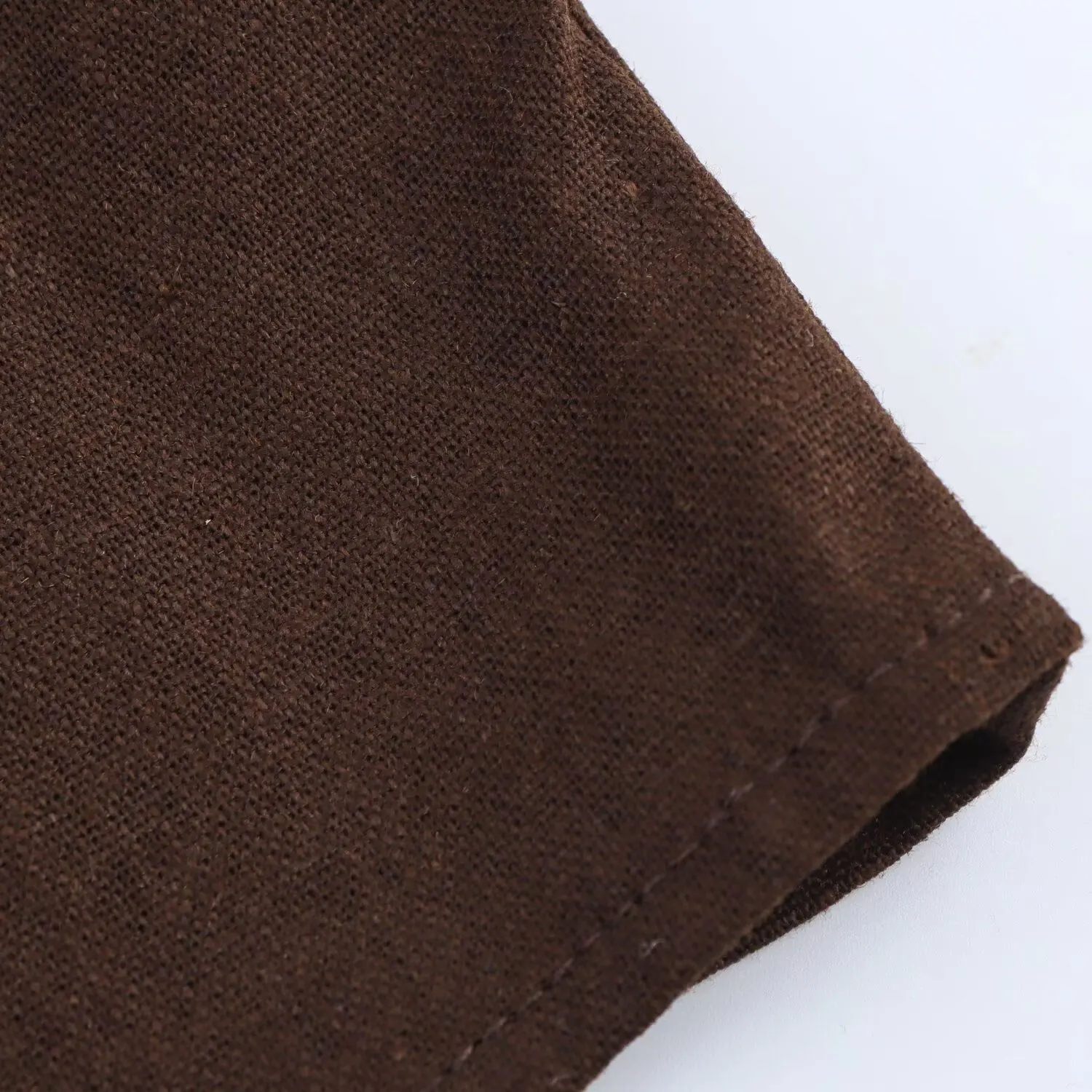 TRAFZA Women’s Summer Vintage Cozy Linen Midi Dress Solid Lapel Single-breasted Waist With Side Loops Fake Pockets Trendy Dress