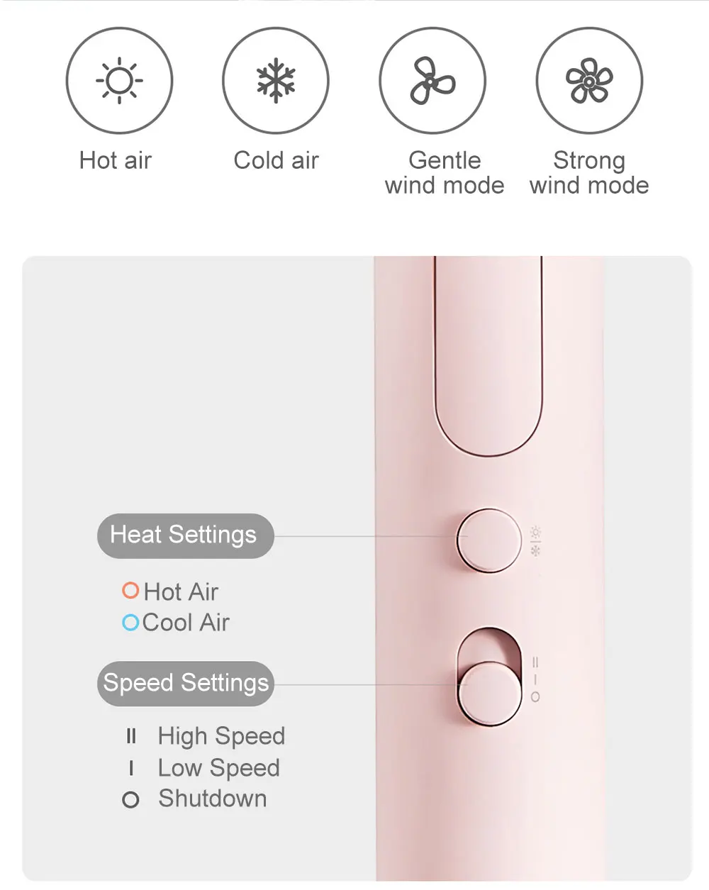 Two Heat and Speed ModesSwitch Instantly with a Gentle Press:The hair dryer offers two heat and speed modes, catering to differentblow-drying needs. Switching between hot and cold air is as simple as agentle press, allowing you to enjoy the desired temperature mode.